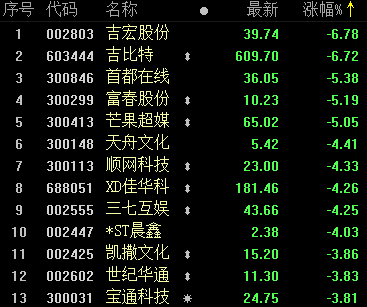 个股方面,吉宏股份、吉比特跌近7%,芒果超媒、首都在线、富春股份跌超5%。